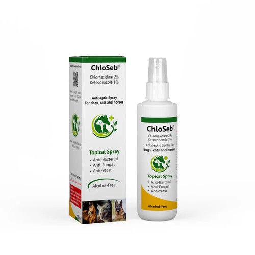 ChloSeb® یک اسپری موضعی برای سگ، گربه و اسب است که حاوی کلرهگزیدین (ضد باکتری) و کتوکونازول (ضد قارچ) است. بدون الکل است و در درمان اختلالات و عفونت های پوستی مفید است.