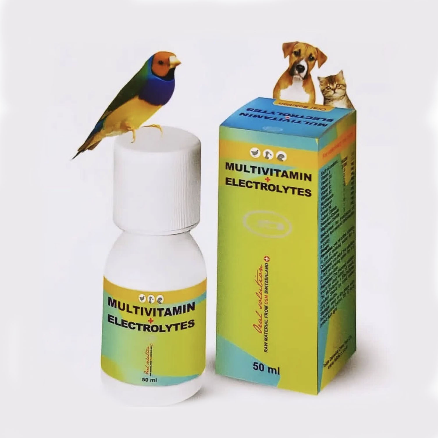 محلول مولتی ویتامین + الکترولیت در بسته بندی 50 میلی لیتری تولید شرکت تولید داروهای دامی ایران برای پیشگیری و درمان عوارض ناشی از کمبود ویتامین و الکترولیت در طیور