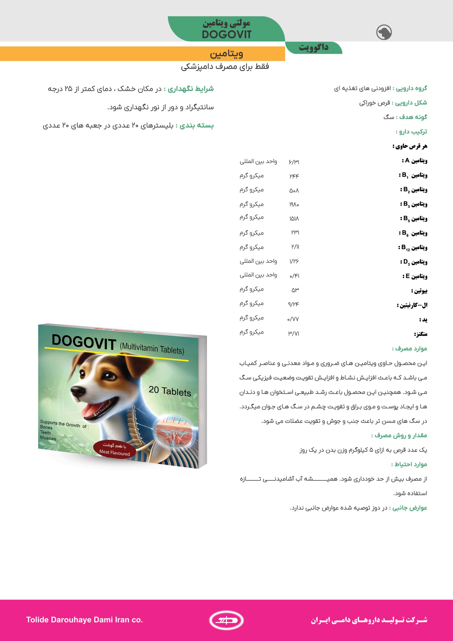 این محصول حاوی ویتامین های ضروری و مواد معدنی و عناصر کمیاب می باشد که باعث افزایش نشاط و افزایش تقویت وضعیت فیزیکی سگ می شود همچنین این محصول باعث رشد طبیعی استخوانها و دندانها و ایجاد پوست و موی براق و تقویت چشم در سگهای جوان میگردد. در سگ های مسن تر باعث جنب و جوش و تقویت عضلات می شود.