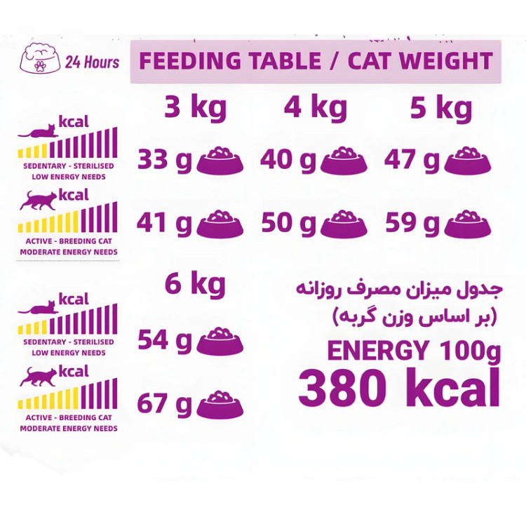 80% از پروتئین های موجود در این غذا منشاء حیوانی دارند و ترکیب آن ها با برنج؛ به هضم بهتر غذا و مدفوع منظم تر کمک می کند.وجود پروبیوتیک ها و فیبرهای ویژه باعث بهبود سلامت دستگاه گوارش و فلور روده می شود. امگا3 وامگا 6 موجود در روغن و گوشت ماهی سالمون؛ به درخشندگی و سلامت پوست و موی گربه کمک می کند. ترکیب این فرمول با بیوتین؛ روی و مس قابل جذب؛ باعث تقویت پوست و موی سالم تر می شود.